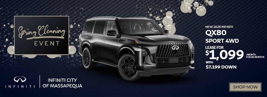 Lease a New 2026 QX80 SPORT 4WD (Example VIN: JN8AZ3DB7T9434377) for $1,099 a month for 24 months with $7,199 down payment, plus 1st payment, upfront fees, registration and taxes. Subject to Tier 1 credit approval, not all will qualify. No security deposit required. Lease selling is based on MSRP of $105,895. Late fees, early termination fee, excess wear and tear, auto insurance, scheduled maintenance, and $.25 per mile over 10,000 miles per year apply. Offer expires 4/30/2026.