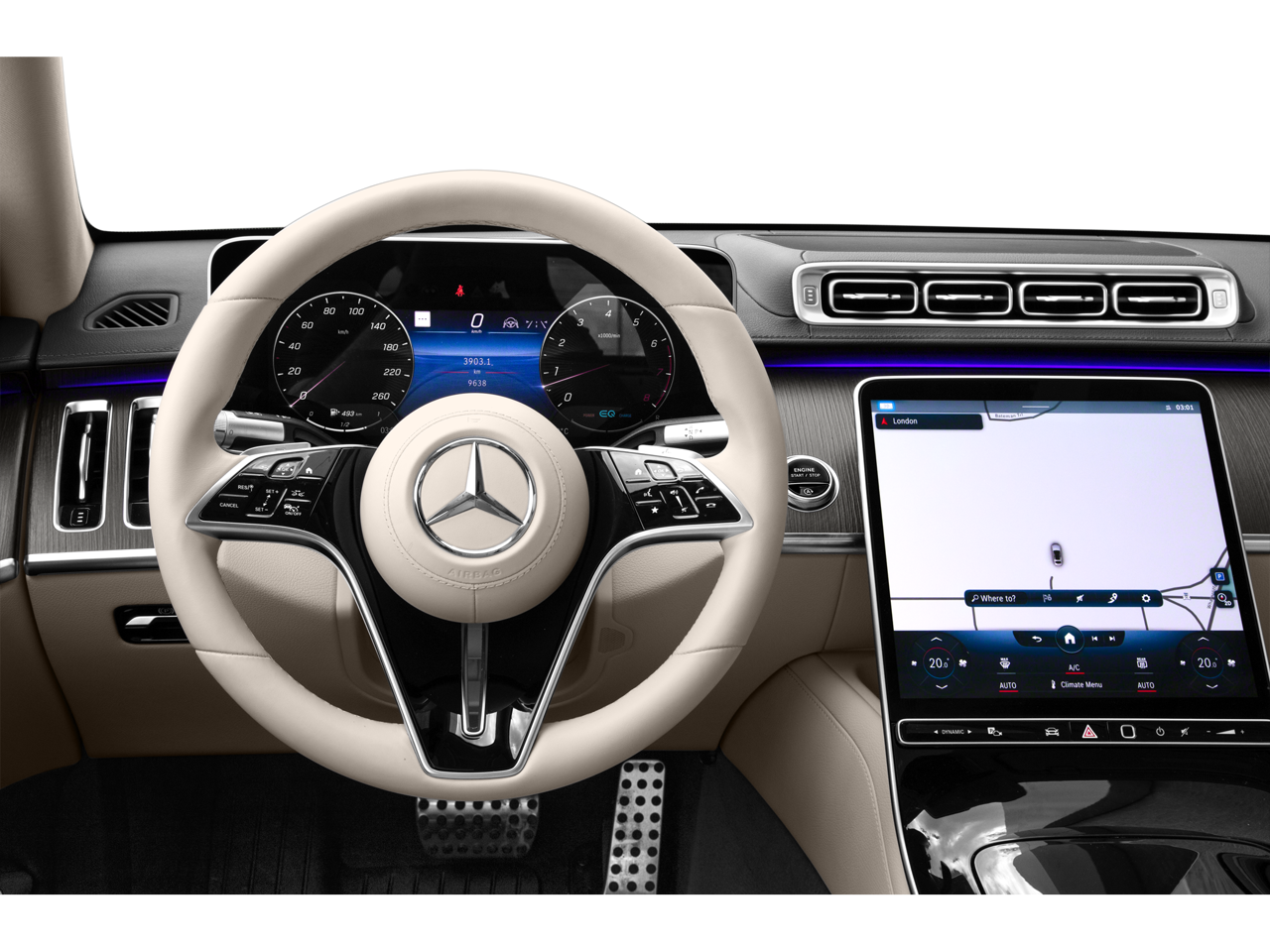 - Radio: MBUX Infotainment System w/Navigation -inc: 12.3 digital instrument cluster, 12.8" OLED touch center display, 'Hey Mercedes' voice control, augmented video for navigation, wireless charging front, wireless smartphone integration (Apple Carplay, Android Auto), Burmester 3D surround sound w/sound personalization, SiriusXM radio w/free trial period and online music streaming